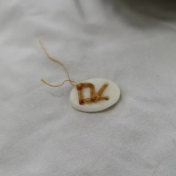 背面ボタン刺繍にほつれ、フロントボタンに変色が見られます。