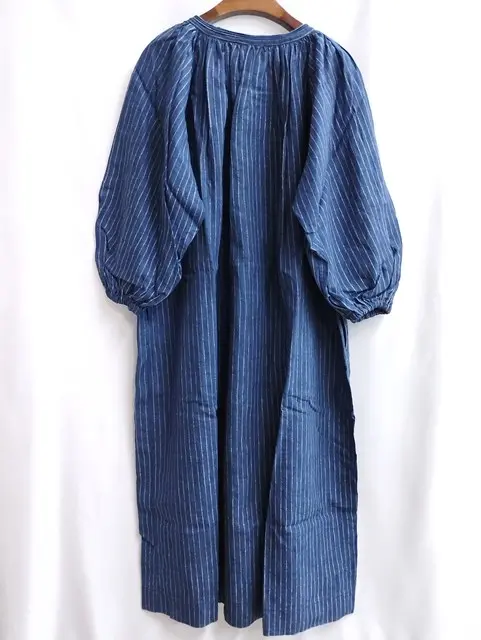 45R ワンピース 0 インディゴ 長袖 藍染 ピンストライプ 麻100 日本製